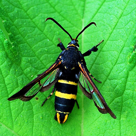 | 昆蟲信息 | 葡萄透翅蛾(Paranthrene regalis) 別名:葡萄透羽蛾,葡萄鉆心蟲。 成蟲體長約20毫米,翅展30-36毫米,體藍黑色。頭頂、頸部、后胸兩側(cè)以及腹部各節(jié)聯(lián)接處呈橙黃色,前翅紅褐色,翅脈黑色,后翅膜質(zhì)透明,腹部有3條黃色橫帶,雄蟲腹部末端有一束長毛。1年發(fā)生1代,以老熟幼蟲在葡萄枝蔓內(nèi)越冬。翌年4月底5月初,越冬幼蟲開始化蛹。5-6月成蟲羽化。在7月上旬之前,幼蟲在當年生的枝蔓內(nèi)為害;7月中旬至9月下旬,幼蟲多在二年生以上的老蔓中為害。10月份以后幼蟲進入老熟階段,繼續(xù)向植株老蔓和主干集中,在其中短距離地往返蛀食髓部及木質(zhì)部內(nèi)層。使孔道加寬,并刺激為害處膨大成瘤,形成越冬室,之后老熟幼蟲便進入越冬階段。 |